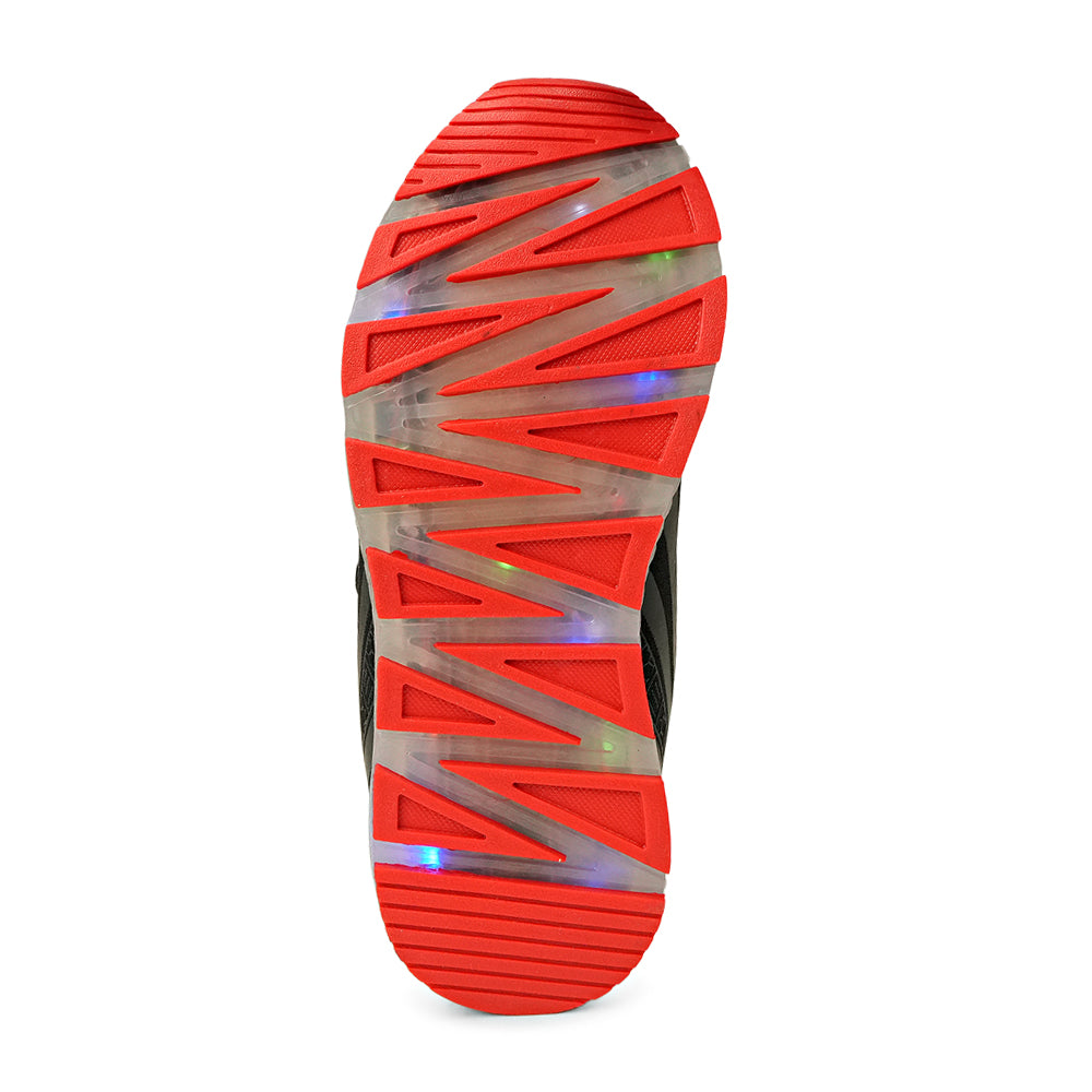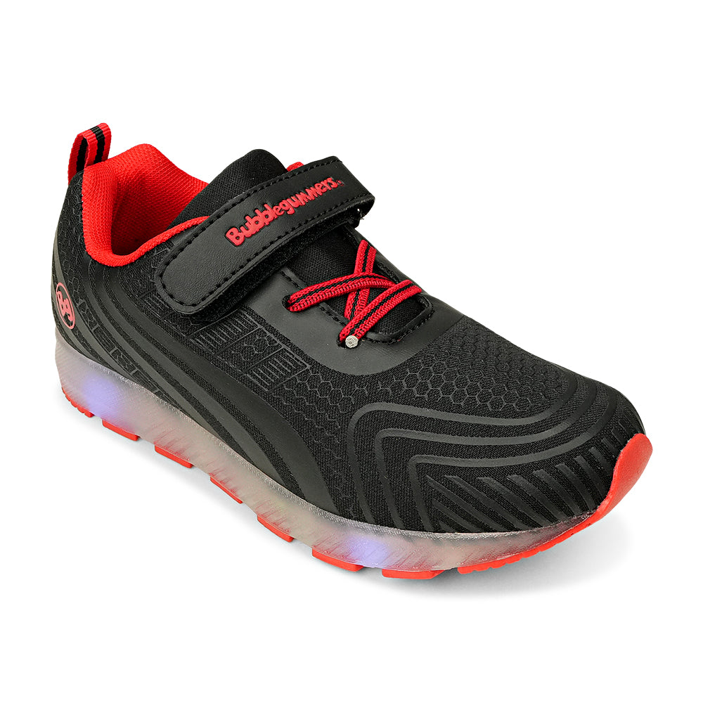Features a dynamic combination of stealthy black with bright red accents on the lining, strap, and outsole trim, giving the shoe a sporty, energetic look. The upper incorporates lightweight, breathable mesh to keep feet cool and comfortable during active play and running. Reinforced with synthetic overlays and a sturdy, patterned outsole to withstand the wear and tear of active play.A handy heel pull-tab helps kids quickly slip the shoe on and off.