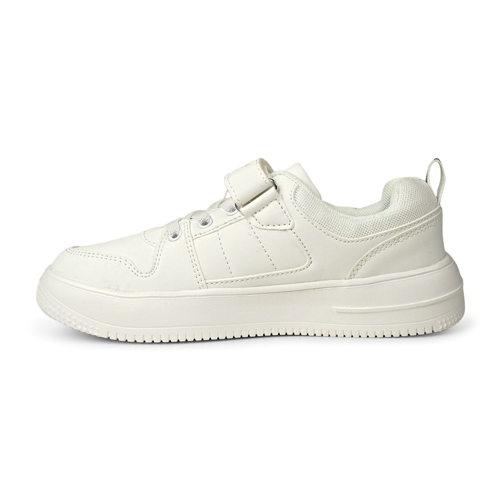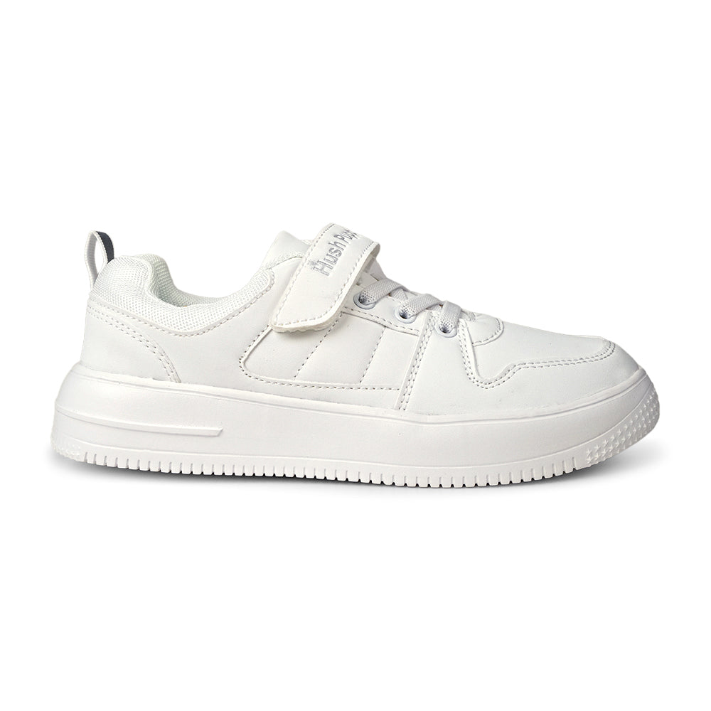 Step up their footwear game with these pristine white sneakers from Hush Puppies. Designed for those who value both aesthetics and practicality, these shoes offer a crisp, clean look that pairs perfectly with school uniforms, casual weekend wear, or active play outfits. This sneaker is a durable staple featuring the signature Hush Puppies comfort. Built for performance, the shoe includes a prominent hook-and-loop strap (paired with laces) for a secure and easy-on, easy-off fit. Crafted with a smooth synthetic upper, these shoes are easy to clean, helping maintain that "brand new" white look longer, from the playground to the classroom.