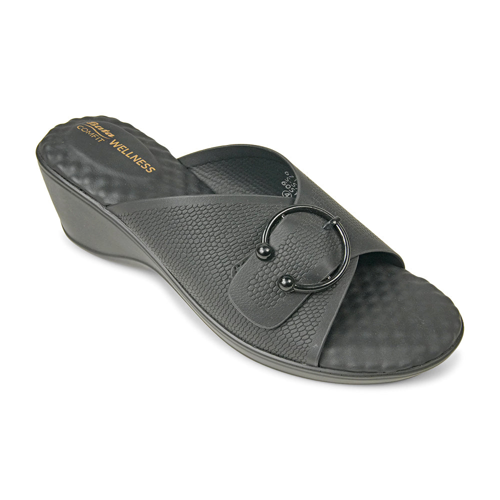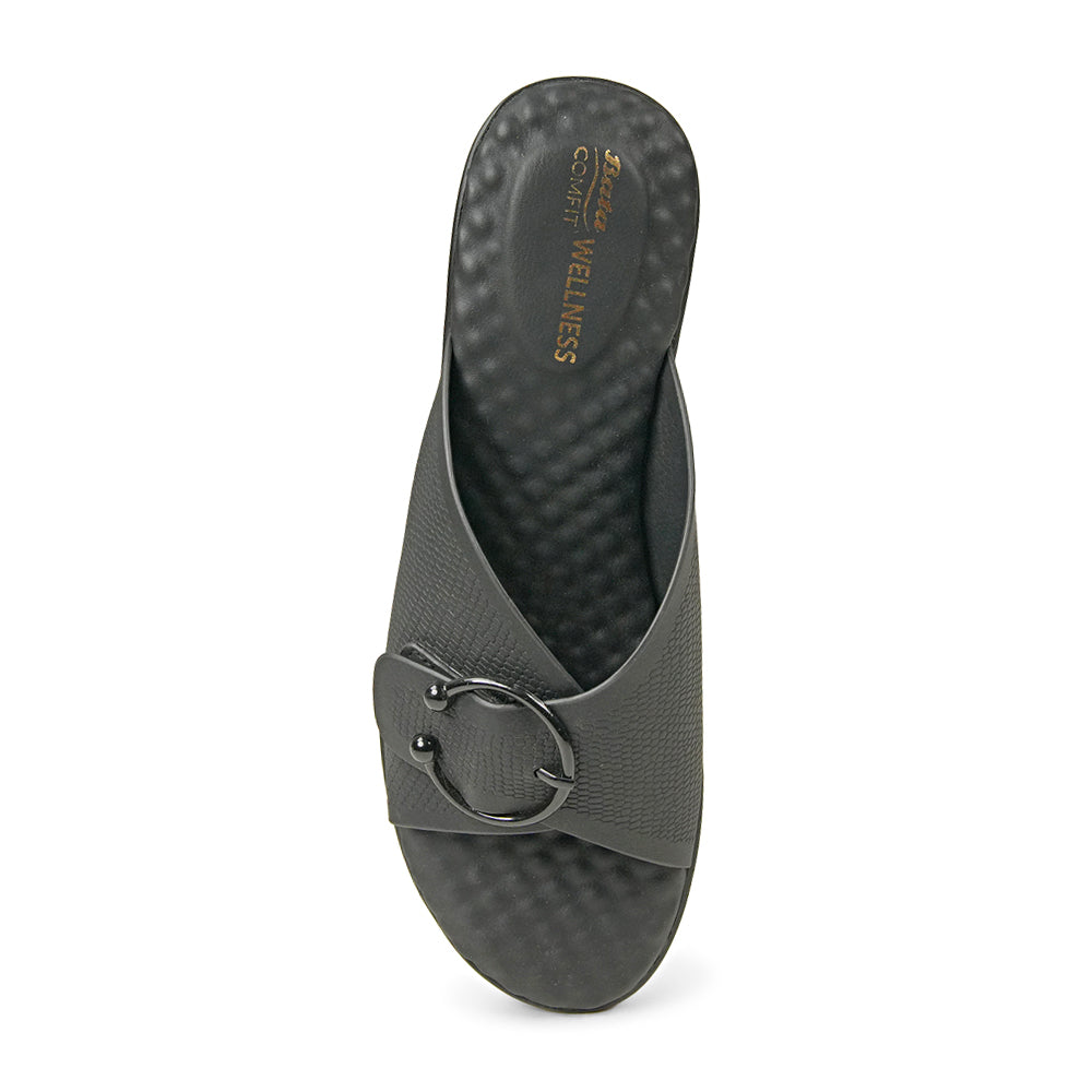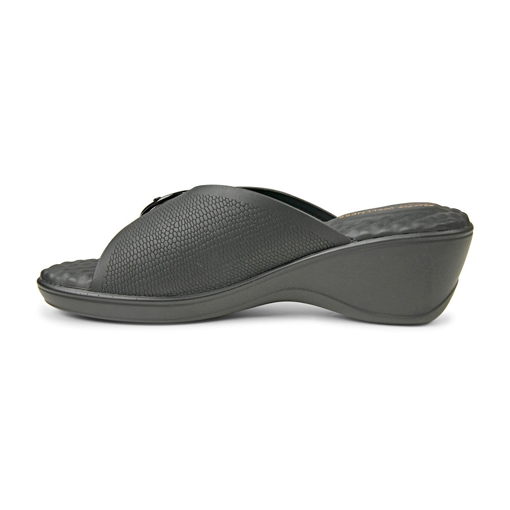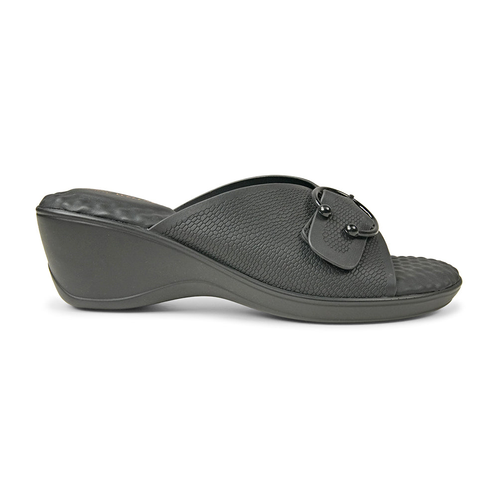 Upgrade your daily footwear with a perfect blend of style and support. These Women's Wedge Slide Sandals are designed for the woman who is always on the move but refuses to sacrifice elegance for comfort. Featuring a sophisticated textured matte finish and a modern buckle detail, these slides transition effortlessly from a morning at the office to a casual dinner with friends. The contoured footbed is engineered to cradle your feet, providing all-day cushioning that reduces fatigue. The stable wedge heel offers just the right amount of lift, giving you a confident posture without the strain of traditional heels. Whether you're running errands or attending a garden party, these versatile black sandals are your new go-to choice for effortless summer fashion.