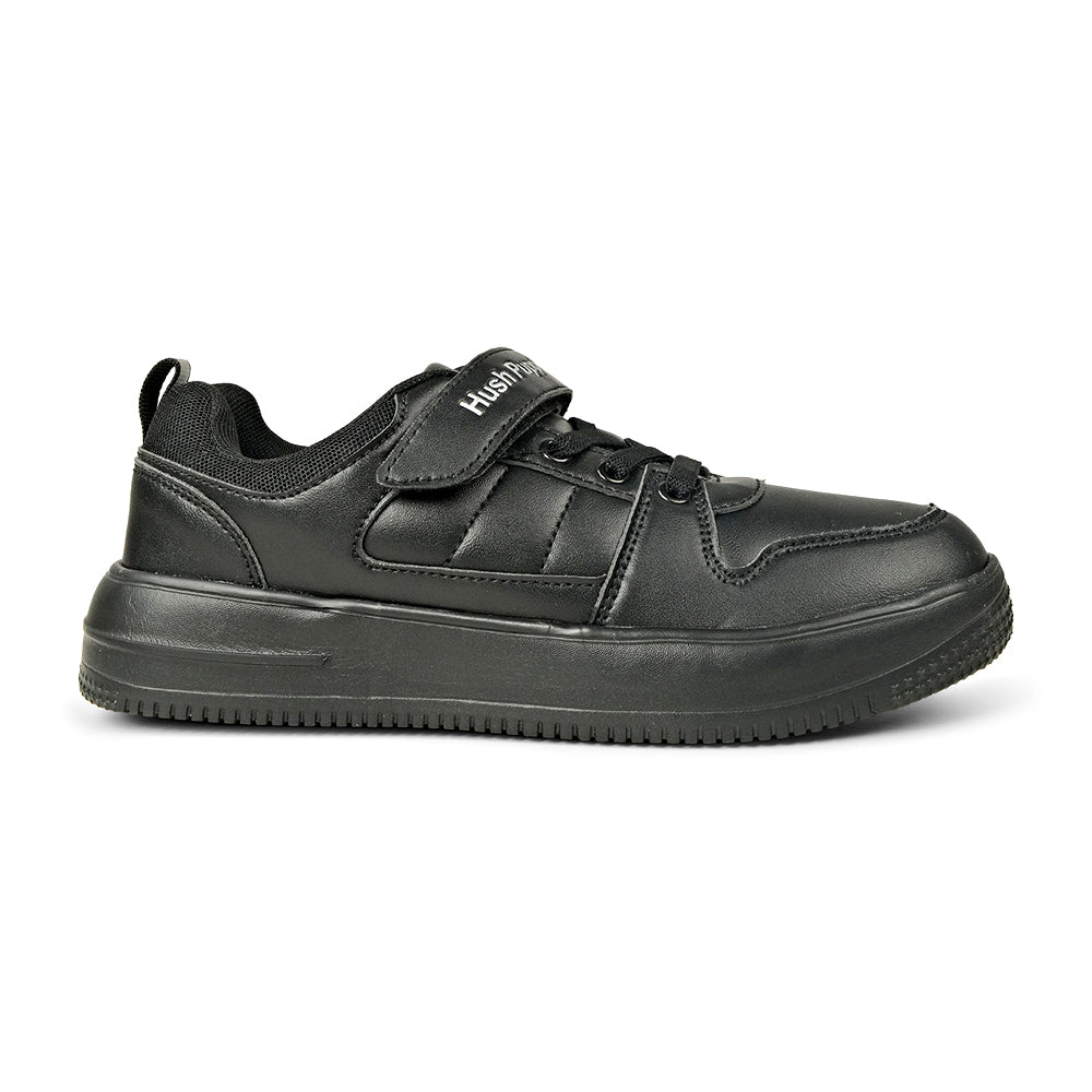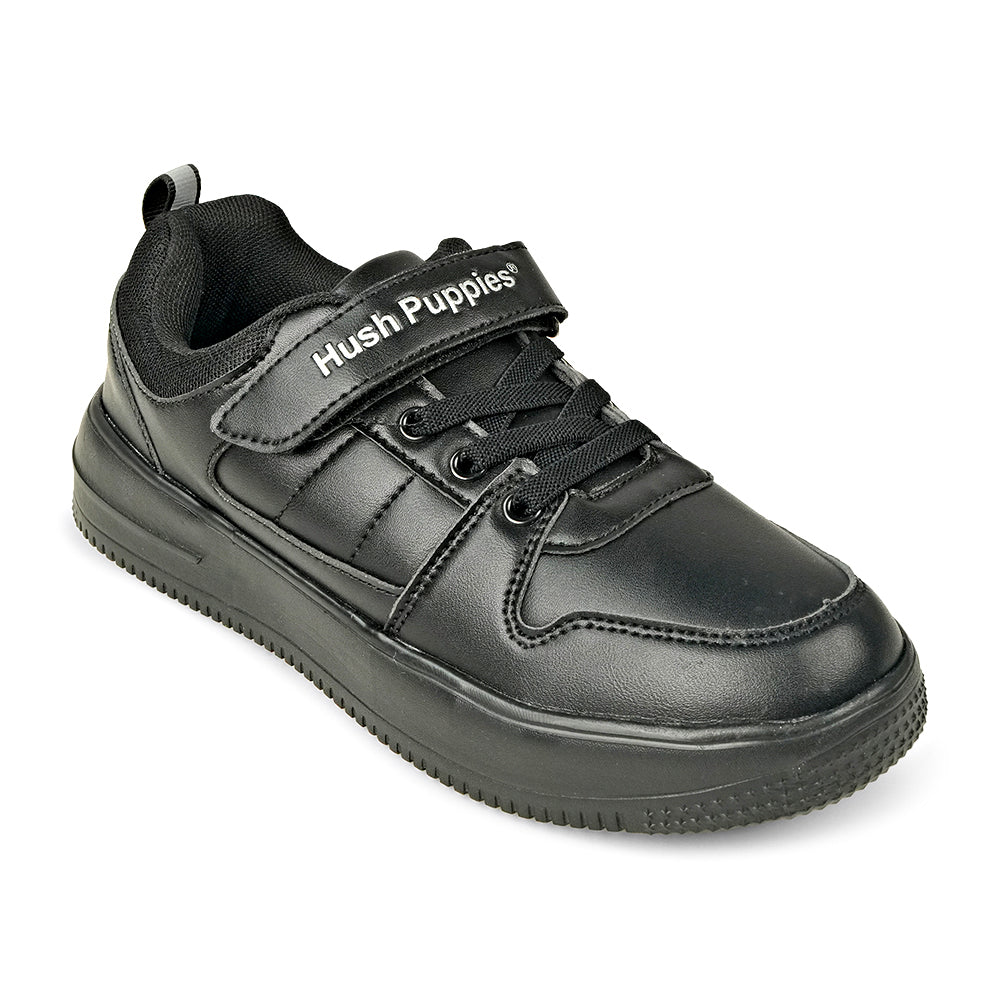 Step up their footwear game with these pristine black sneakers from Hush Puppies. Designed for those who value both aesthetics and practicality, these shoes offer a crisp, clean look that pairs perfectly with school uniforms, casual weekend wear, or active play outfits. This sneaker is a durable staple featuring the signature Hush Puppies comfort. Built for performance, the shoe includes a prominent hook-and-loop strap (paired with laces) for a secure and easy-on, easy-off fit. Crafted with a smooth synthetic upper, these shoes are easy to clean, helping maintain that "brand new" black look longer, from the playground to the classroom.